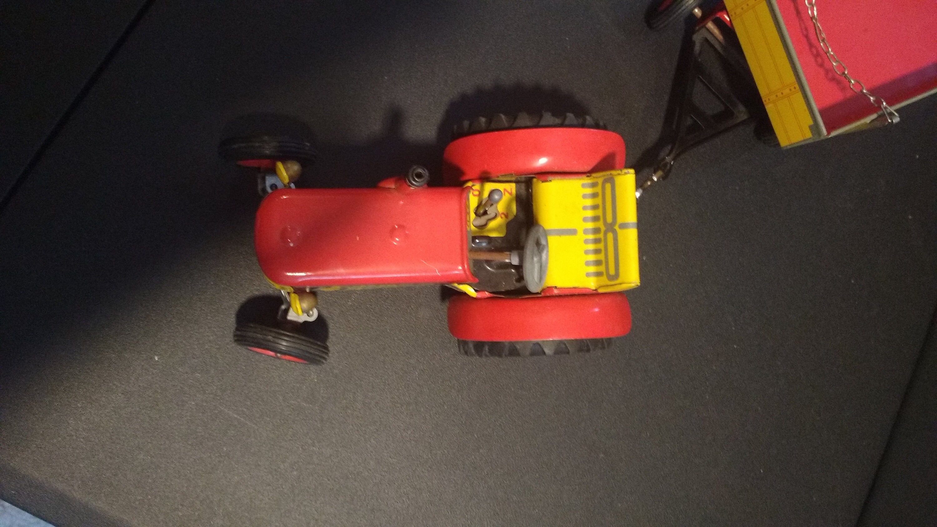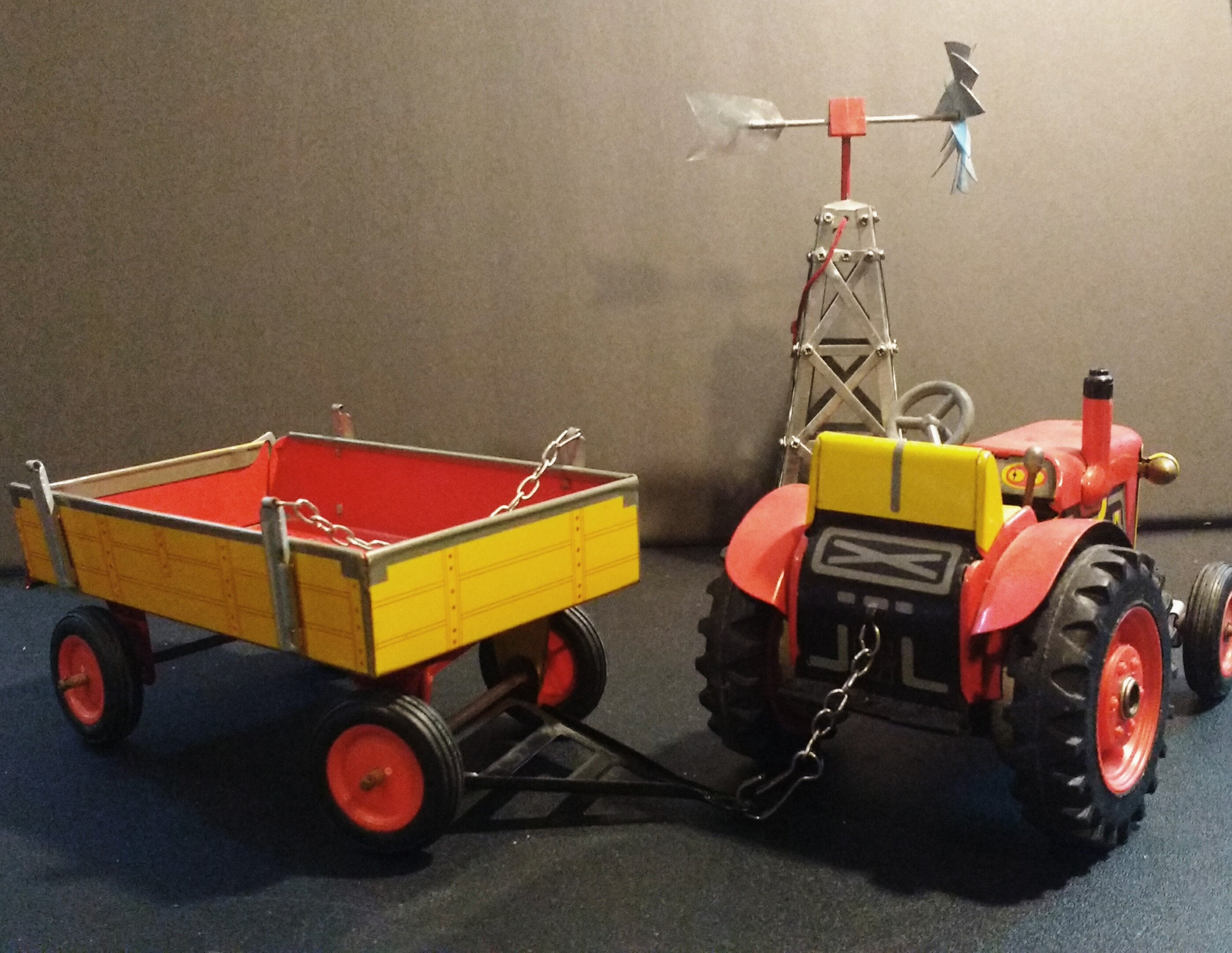 Wind-Up the tractor wheel, pull lever and watch it go! Hay Cart/Trailer connects by clip! Windmill is basically stationary, the blades spin by hand! Nice Collection! Awesome mechanical tin toy!